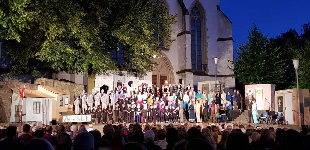 Die Klasse 3b der Oelder Albert-Schweitzer-Schule hatte die Entstehung der Inszenierung über ein halbes Jahr lang begleitet und in den letzten Wochen gemeinsam mit Regisseur Hendrik Becker eine Extra-Szene für die Abendvorstellung einstudiert. Als Puppen-Armee, die von den Grauen Herren dazu benutzt wird, um Momo zu bestechen, hatten sie ihren großen Auftritt und ernteten viel Jubel und wohlverdienten Applaus von den ausverkauften Zuschauerplätzen.